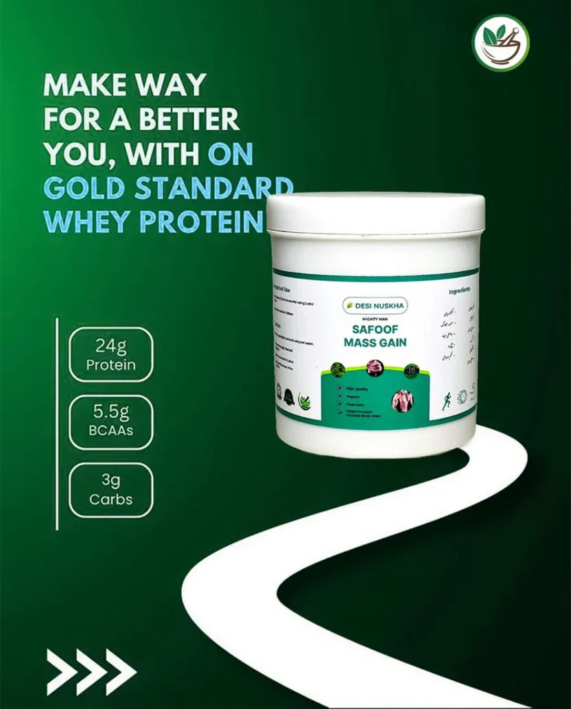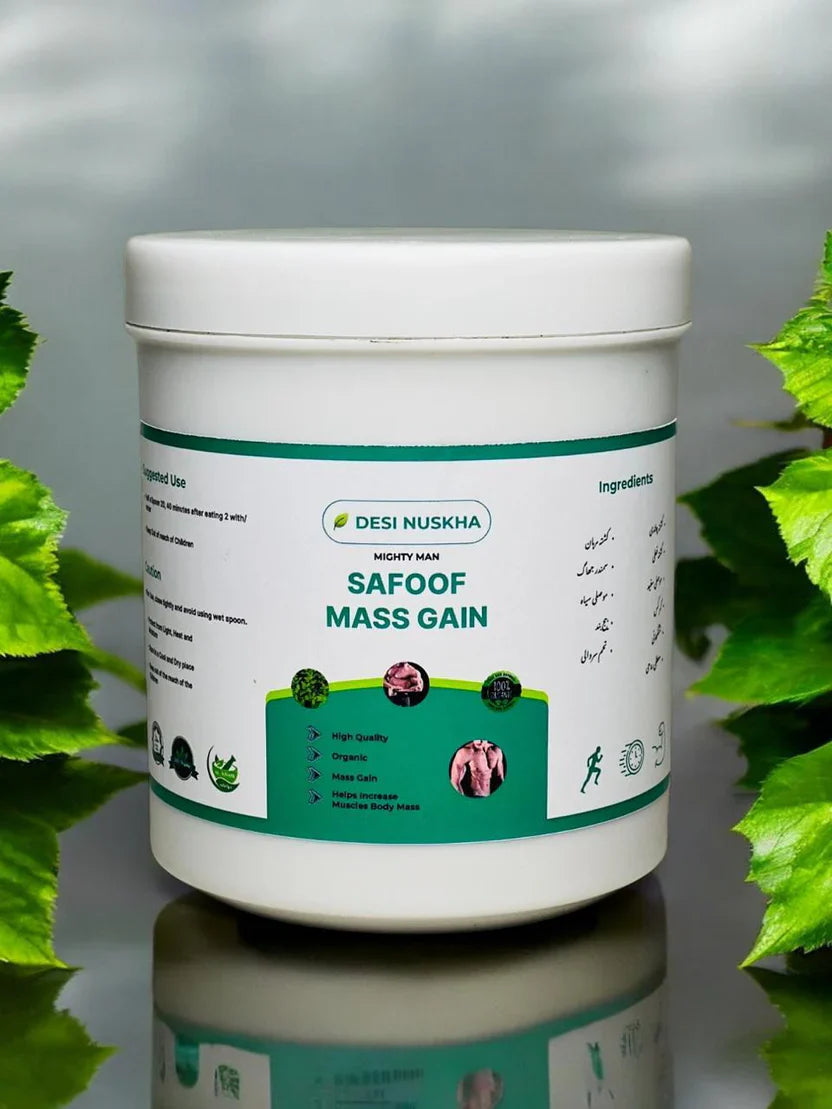 Unlock your body's natural potential with Safoof Mass Gain, a powerful herbal blend crafted to support healthy weight gain and overall vitality. Made from 100% natural ingredients sourced from trusted herbal farms, this unique formula is designed to improve digestion, enhance nutrient absorption, and boost metabolism - helping you achieve a balanced and healthy physique naturally. Each serving of Safoof Mass Gain is enriched with a synergistic mix of Kalwanji, Ajwain, Mint, Saunf, Ginger, Green Tea Extracts, and Carom Seeds, carefully selected for their time-tested benefits in traditional wellness. These potent herbs work together to strengthen appetite, improve gut health, and provide sustained energy throughout the day. •Kalwanji (Black Seeds):Supports metabolism and immunity. 。Ajwain & Carom Seeds: Promote healthy digestion and appetite. • Mint & Saunf (Fennel): Soothe the stomach and aid nutrient absorption. • Ginger: Enhances metabolism and energy levels. Green Tea Extracts: Rich in antioxidants to support overall wellness. Free from chemicals, preservatives, and arti..c additives, Safoof Mass Gain is safe for daily use and suitable for both men and women. Whether you're looking to build muscle, regain healthy weight, or simply feel more energized, this herbal formula is your natural partner on the journey to better health and vitality. Experience the power of nature. Gain strength, energy, and confidence -the herbal way with Safoof Mass Gain.